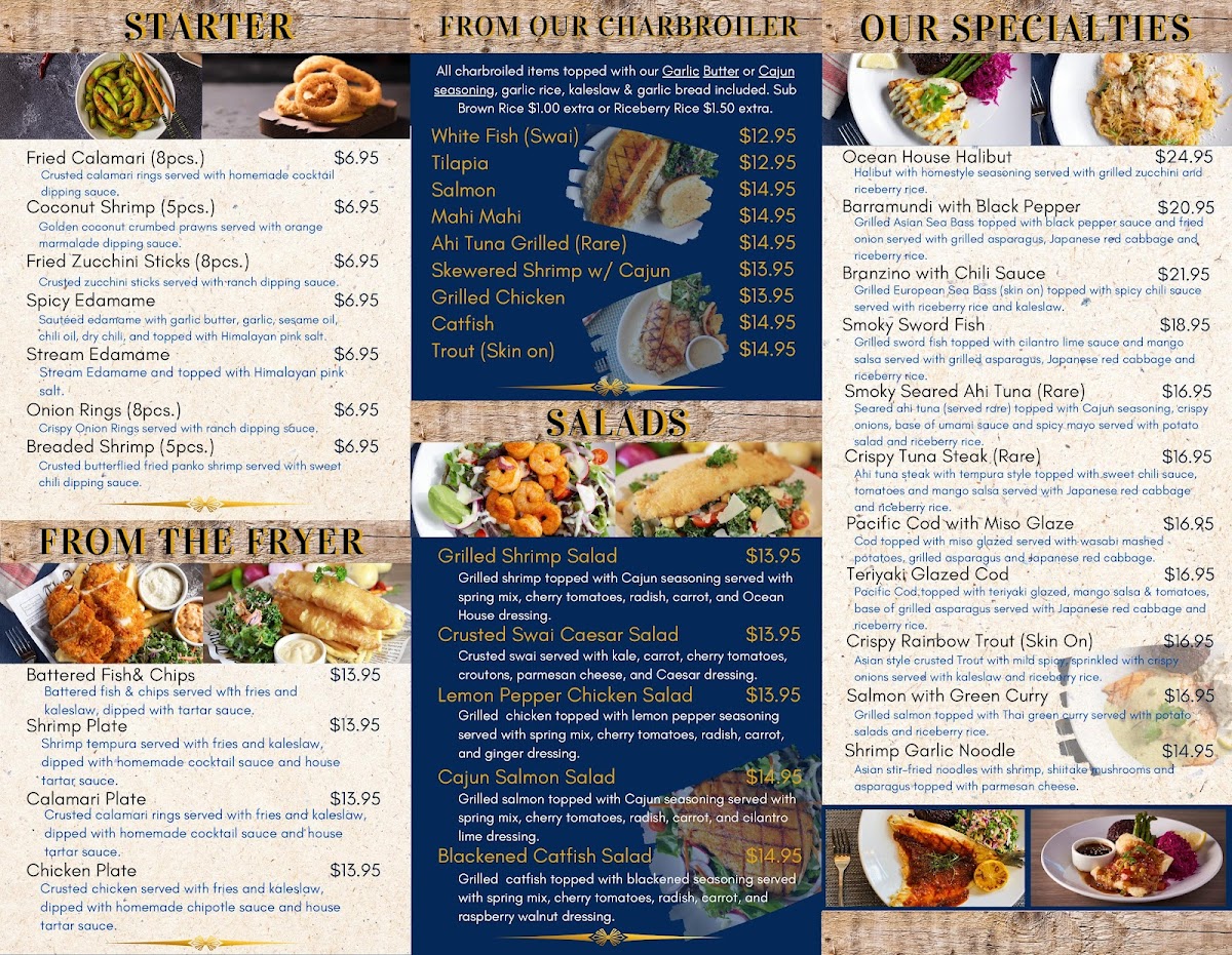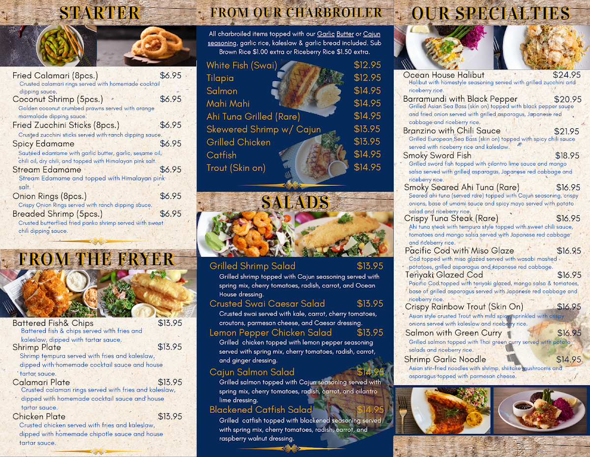 Ocean House Fish Grill excels in serving classic seafood dishes that resonate with every seafood lover. The menu features mouthwatering options like the Battered Fish & Chips, a generous serving of perfectly crispy battered swai accompanied by golden fries and tangy kaleslaw, all for just $16.95. Each bite provides a satisfying crunch, giving way to tender fish that melts in your mouth. Or perhaps you'll opt for their Shrimp Plate, where succulent shrimp tempura is served as a crispy delight that dances with flavor alongside homemade cocktail sauce.